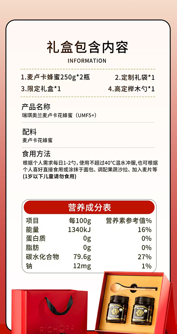 瑞琪奥兰UMF5+麦卢卡蜂蜜礼盒装250g*2/盒