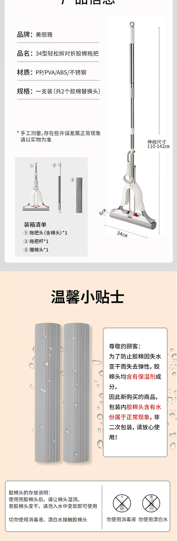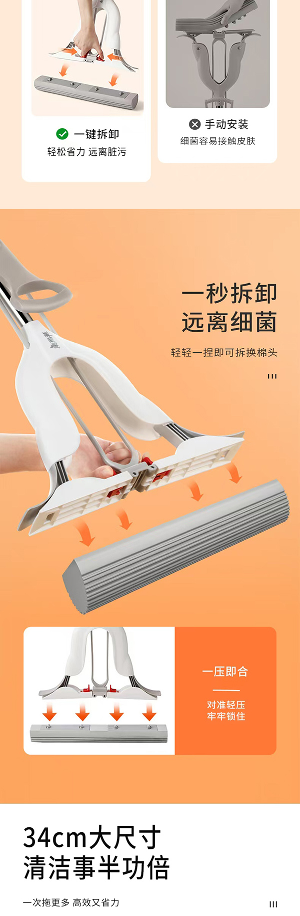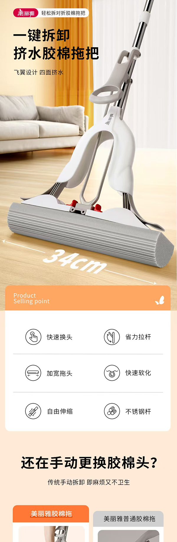 美丽雅轻松拆对折胶棉拖把34cm(加送棉头)