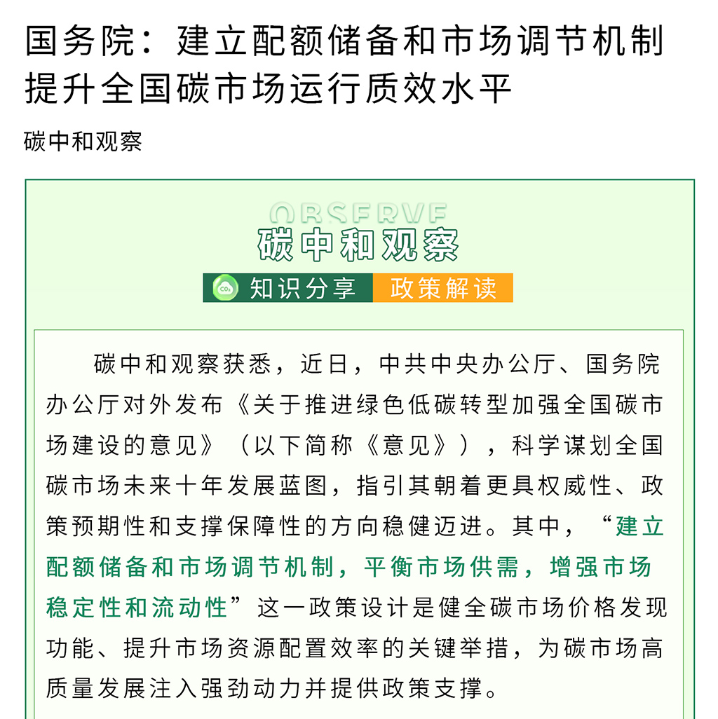 国务院:建立配额储备和市场调节机制,提升全国碳市场运行质效水平
